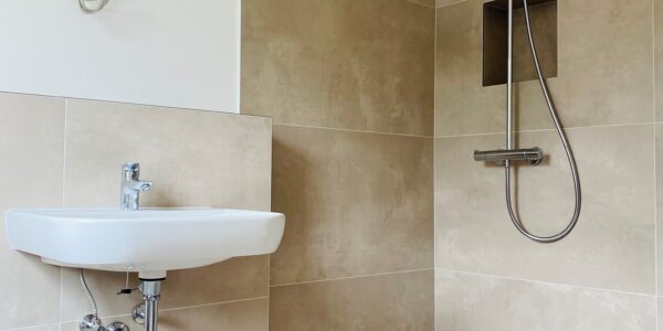 – Vollbad mit bodentiefer Dusche, Glasduschtrennwand, Spiegel & Handtuchheizkörper und Fenster (Lage: OG)